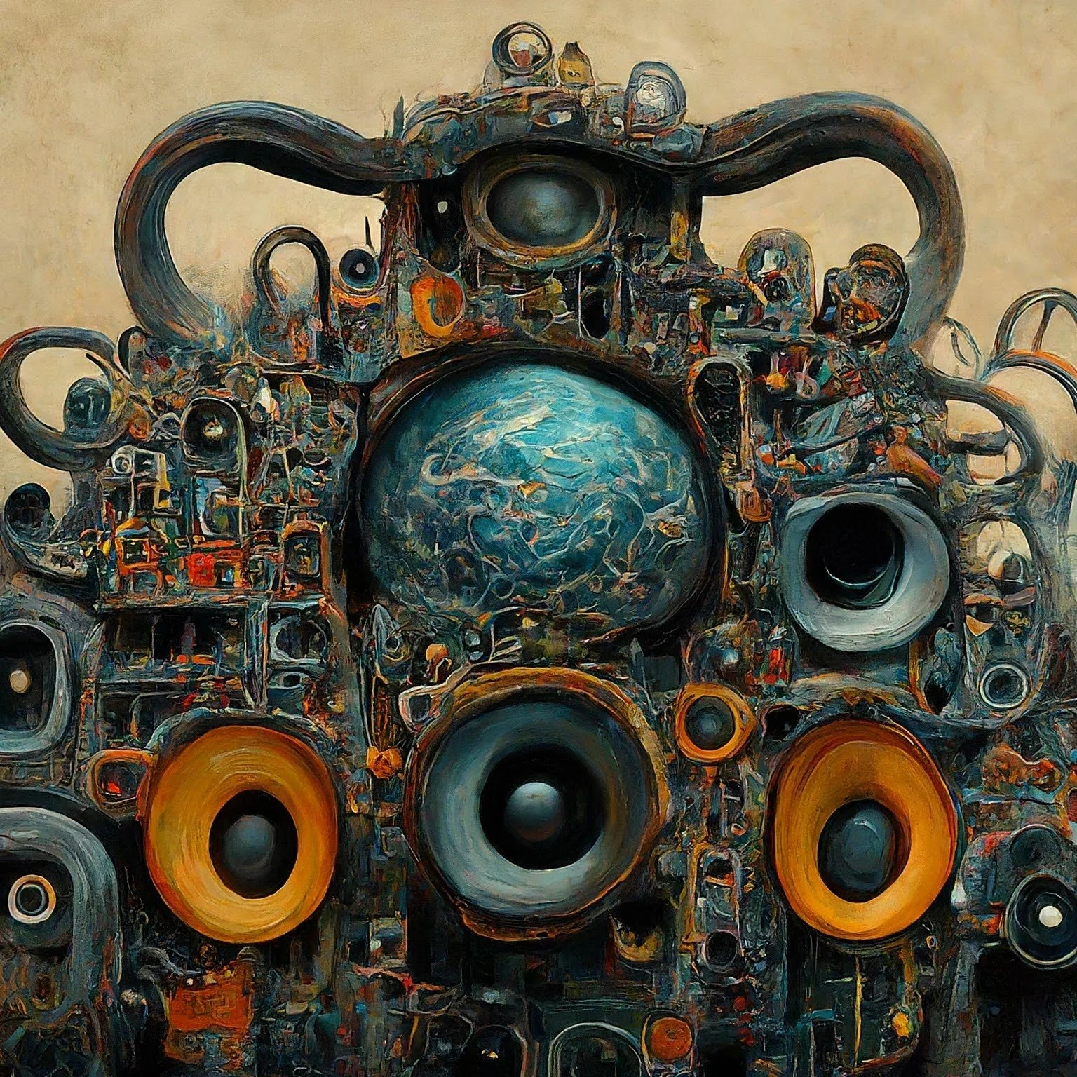 An abstract art piece featuring multiple speakers and audio equipment with a central globe, rendered in a painterly style.