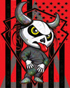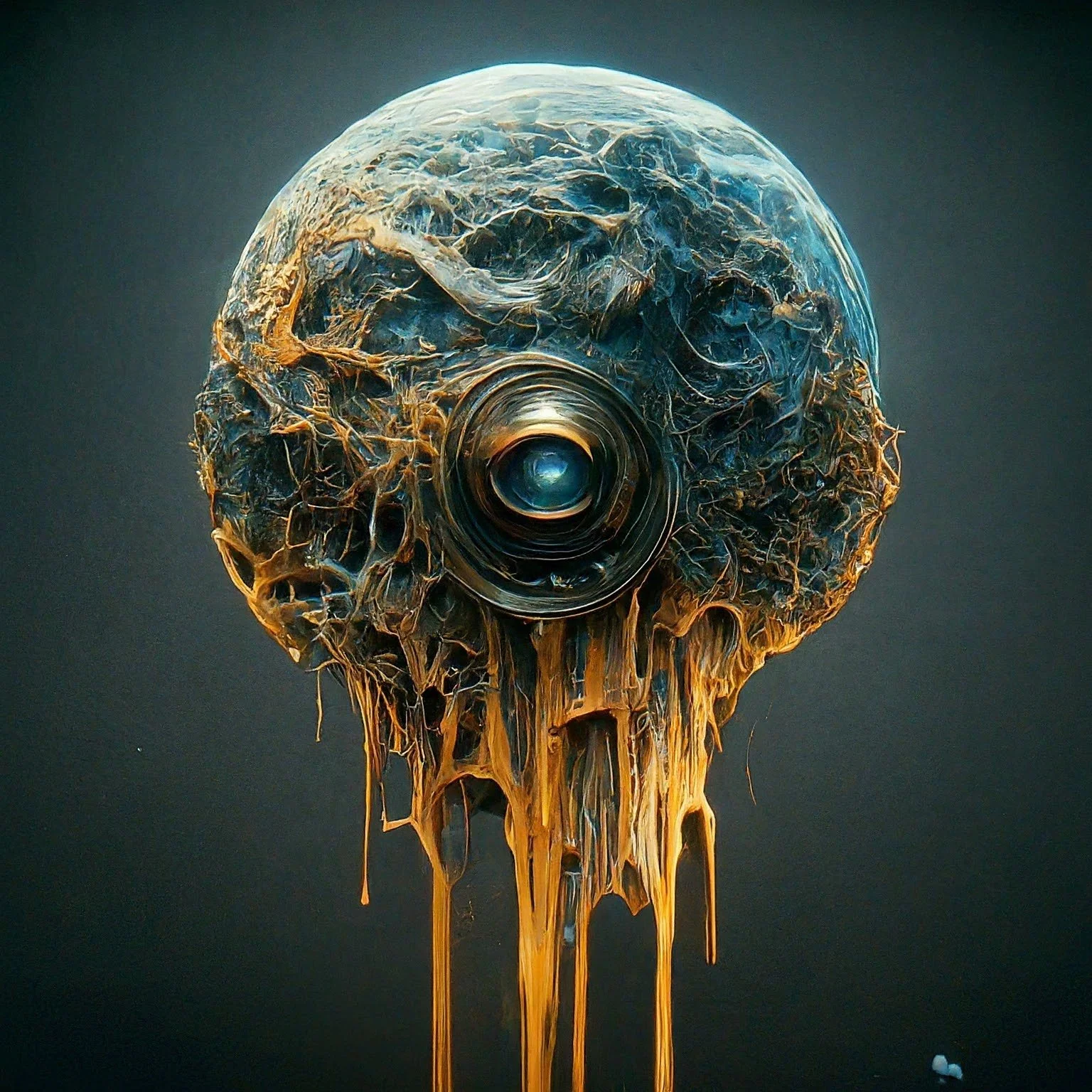 A digital art piece depicting a melting skull with a camera lens in place of its nose, with melted orange-brown drips extending downward.
