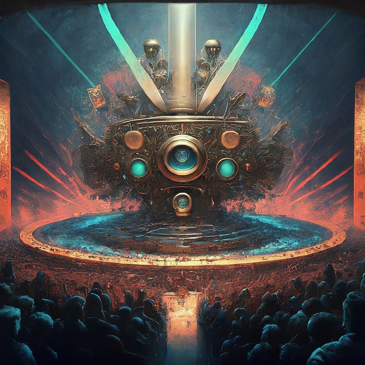 A futuristic, science-fiction scene depicting an audience watching a large, advanced machine with multiple glowing components and futuristic humanoid figures above it, set in a dark, industrial environment with red and blue lighting.