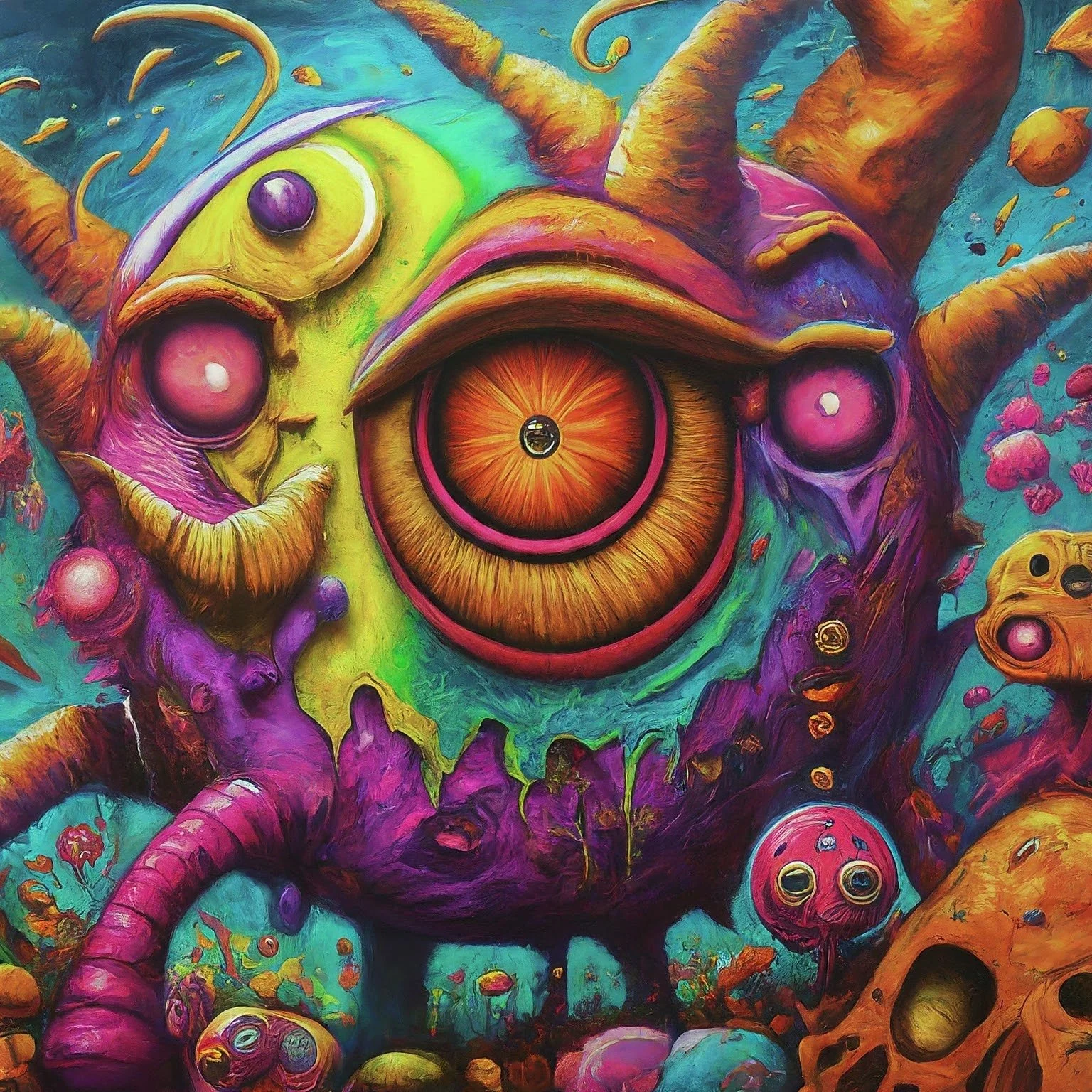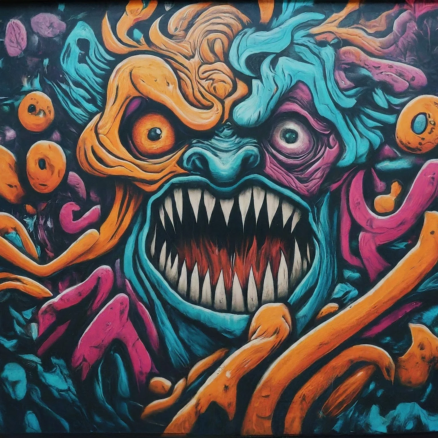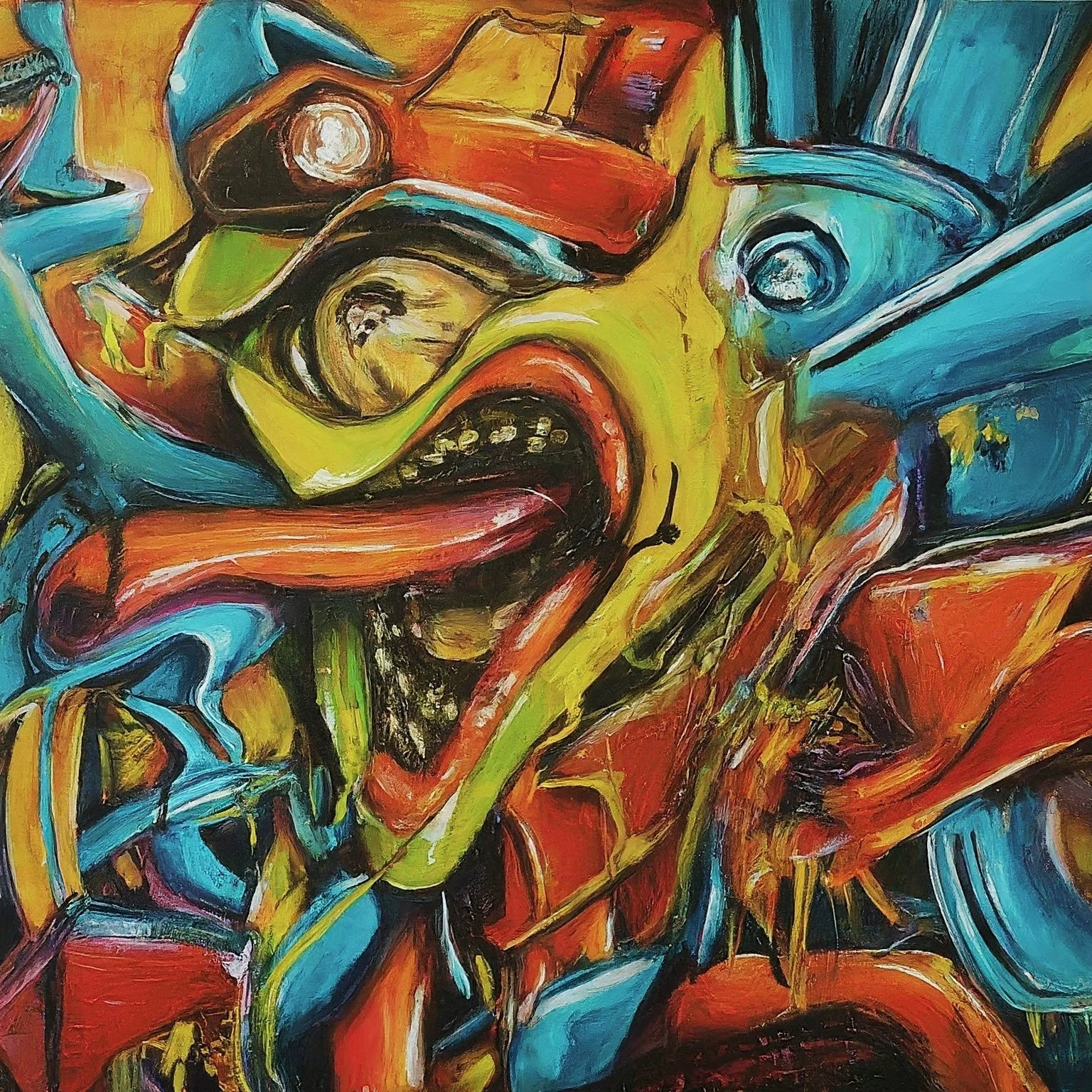 A vibrant, surreal painting of a monstrous face with sharp teeth and multiple colorful, abstract shapes surrounding it.