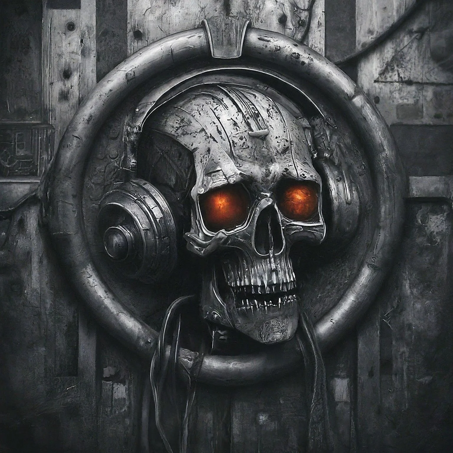 Metal skull with headphones and glowing orange eyes, set against a dark industrial background.