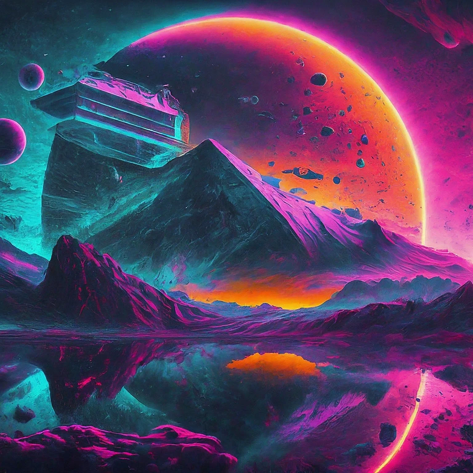 A colorful, abstract sci-fi landscape with neon pink, purple, and blue mountains, a reflective body of water, and a large planet with rings and multiple moons in the background.