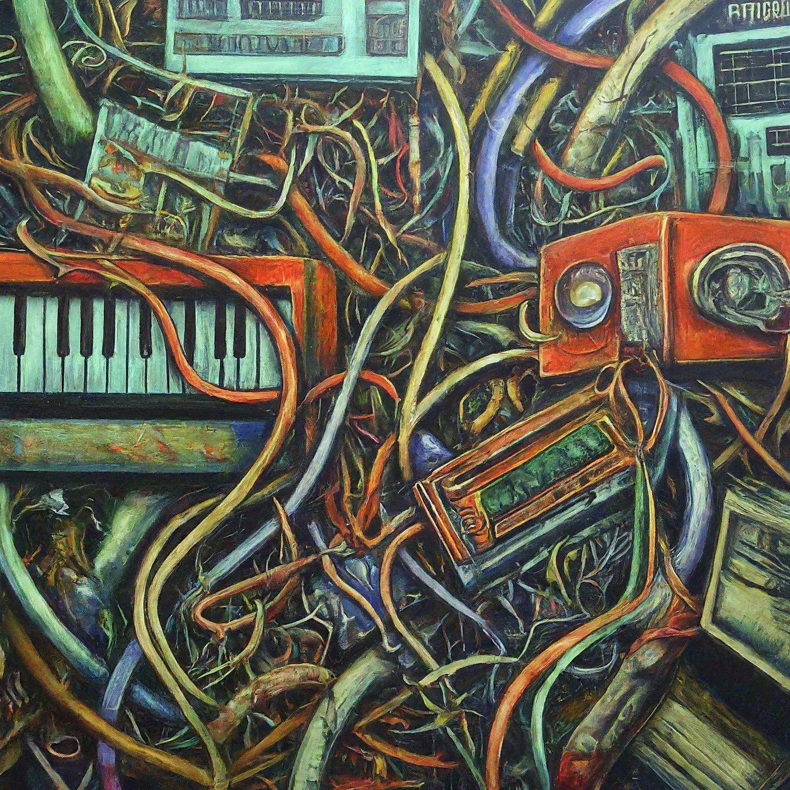 A painting of tangled electronic cords, vintage electronics, and musical instruments including a keyboard, cassette tape, and audio equipment.