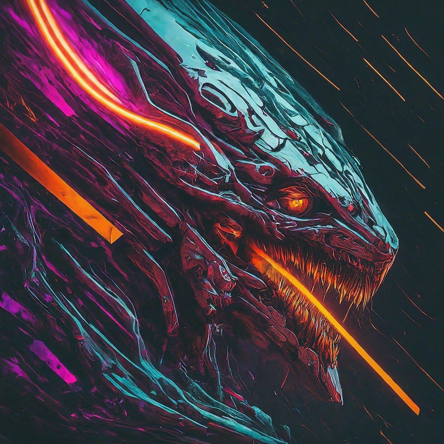 Digital art of a dragon with glowing orange eyes and sharp teeth, highlighted with neon colors including red, purple, and blue, set against a dark background with streaks of orange light.