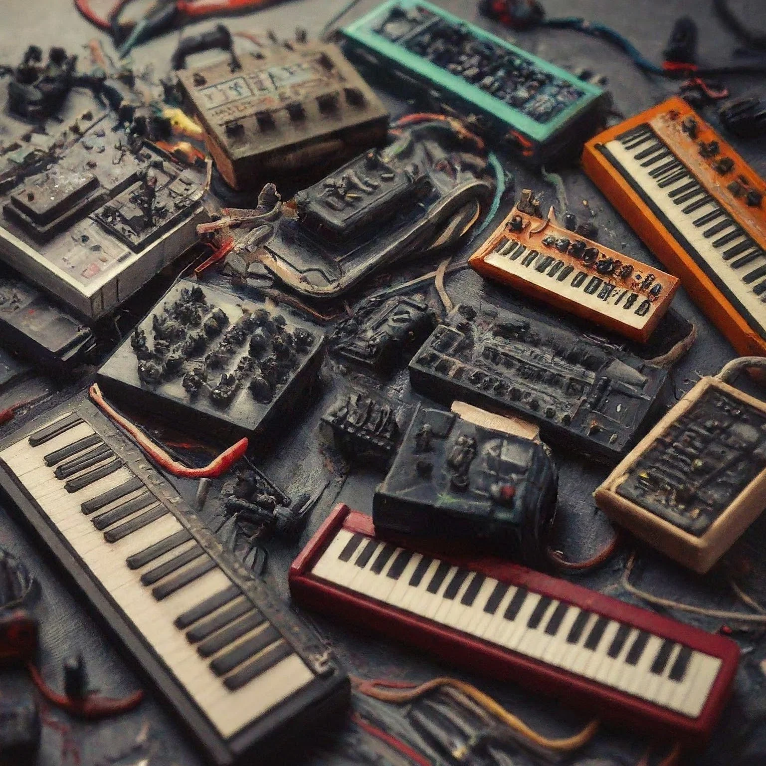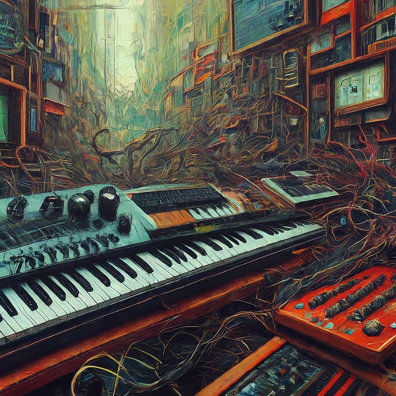 An artistic digital painting of a cluttered room with electronic music equipment, including a keyboard, synthesizer, and other electronic devices, amid tangled wires, with a backdrop of a dystopian cityscape.
