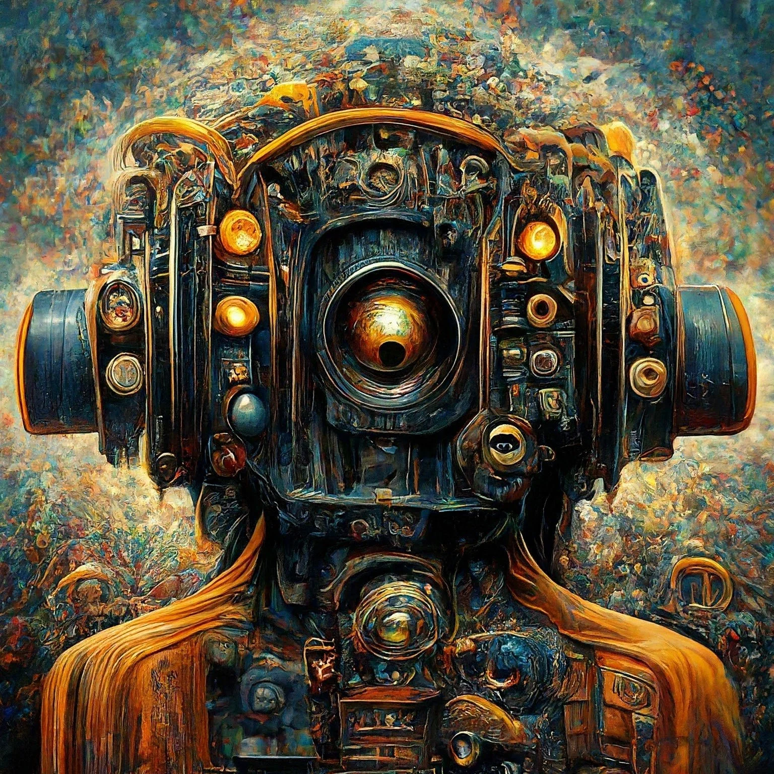 A surreal painting of a vintage camera with glowing lights, set against a textured, colorful background.
