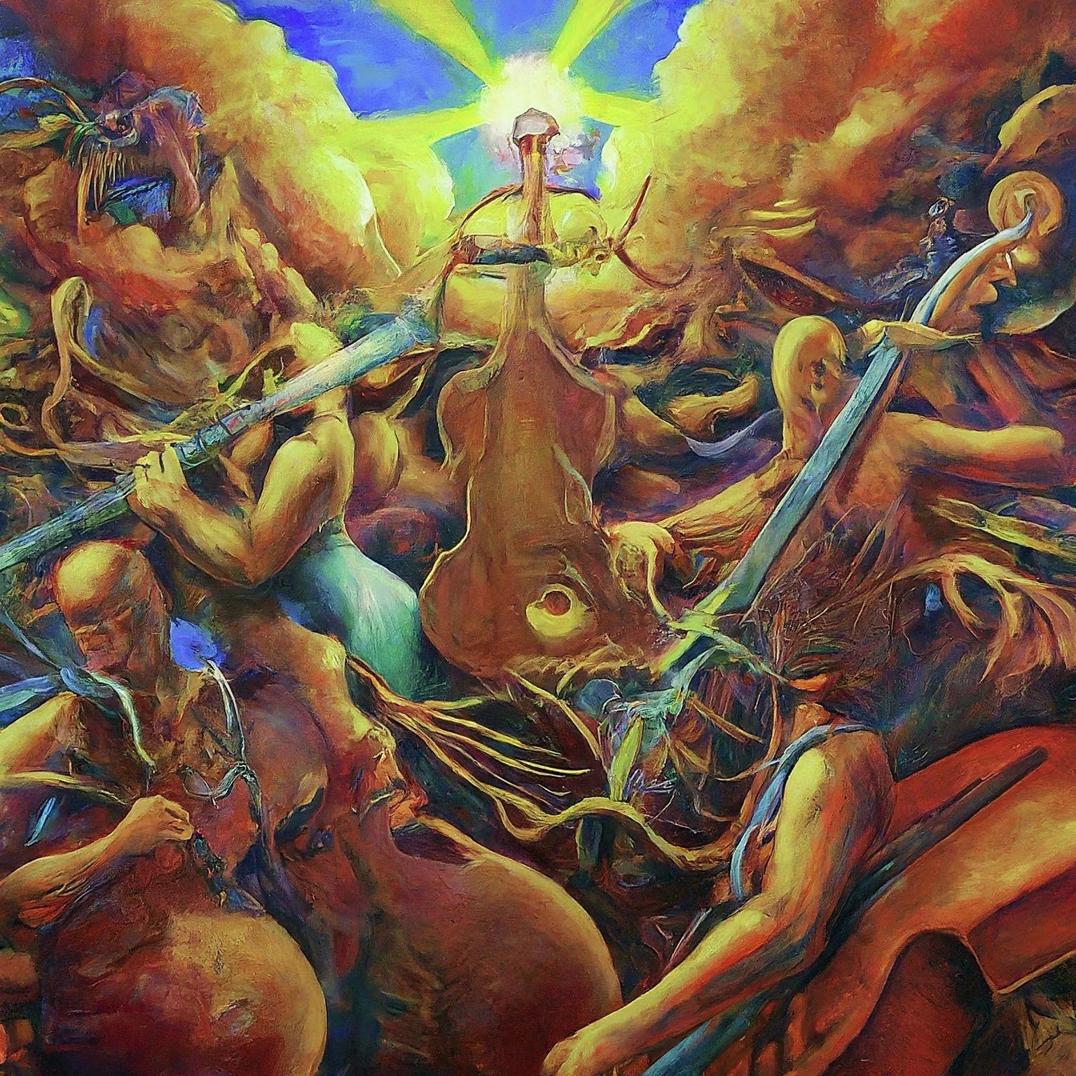 A vibrant painting depicting warrior-like figures with swords, surrounded by mythological creatures, with a glowing light and clouds in the background.
