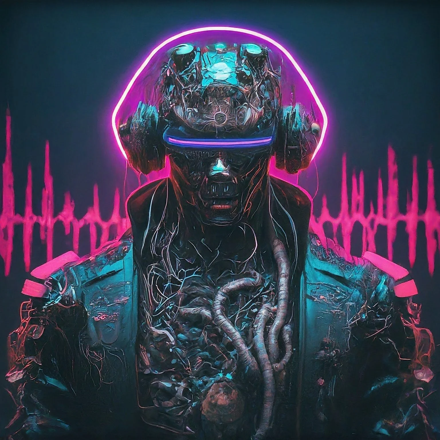 Neon artwork of a futuristic humanoid figure with a skull-like face, wearing a helmet and headphones, with exposed mechanical and organic elements, set against a vibrant pink waveform background.