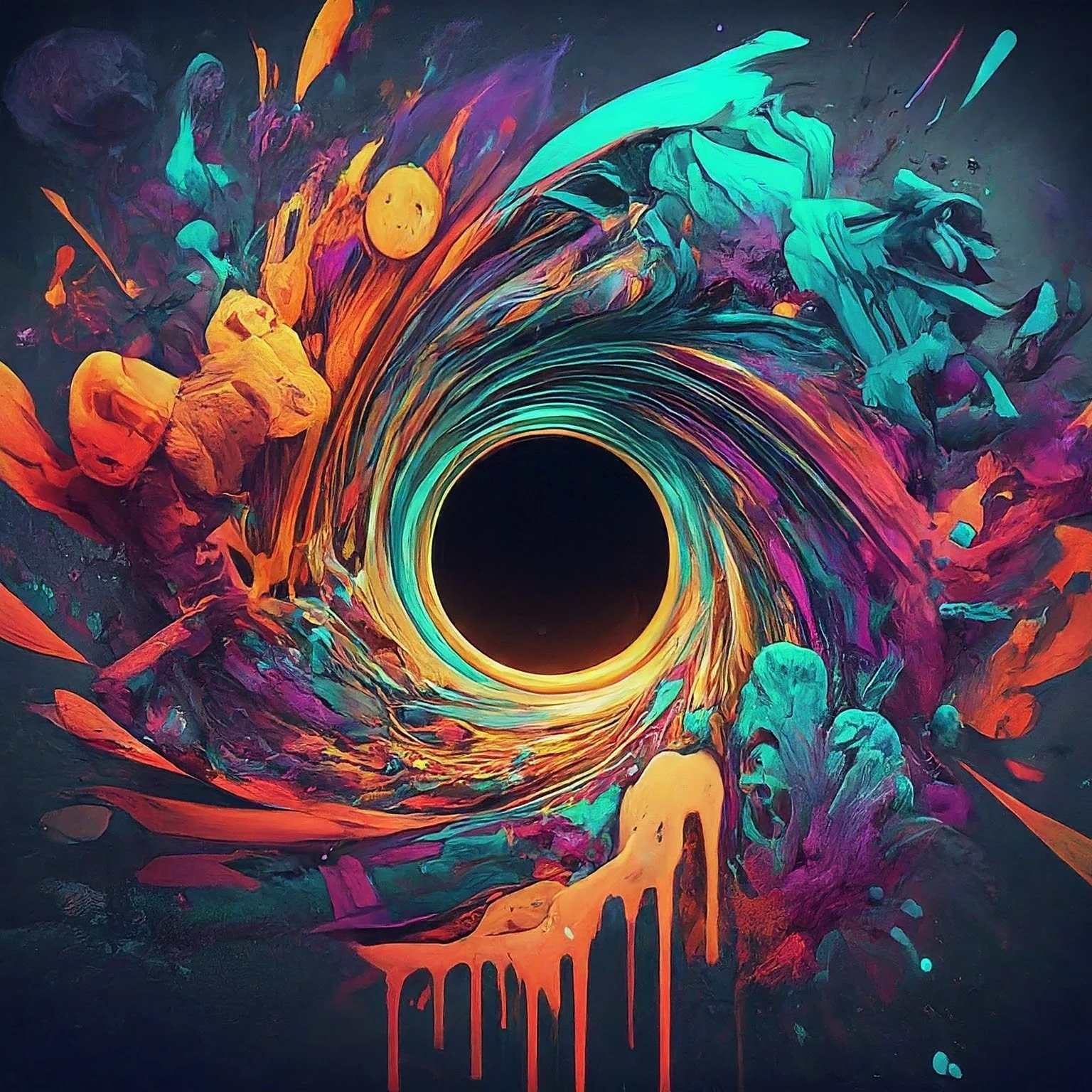 Abstract digital art featuring a swirling vortex with vibrant orange, purple, teal, and pink colors, centered around a black hole-like opening.