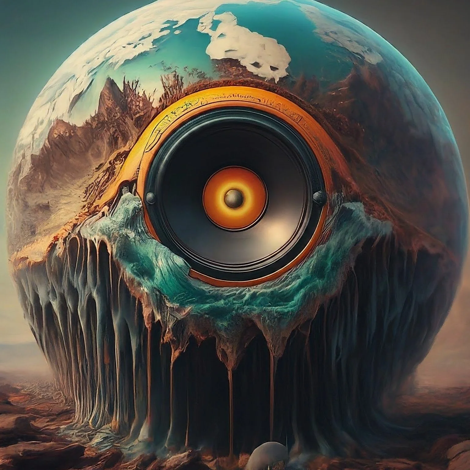 A surreal digital artwork depicting the Earth with a giant speaker at its center, with volcanic and mountainous landscape flowing downward like drips.