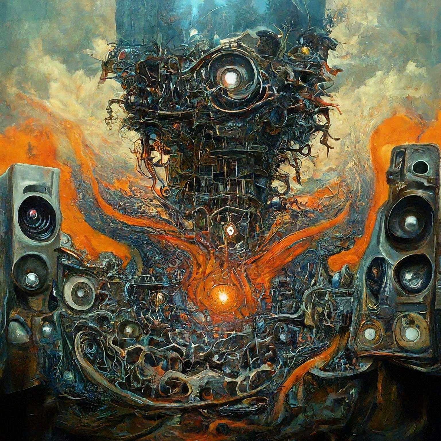 Abstract painting of a large chaotic explosion with speakers, orange flames, and dark chaotic shapes, resembling a surreal, fiery scene.